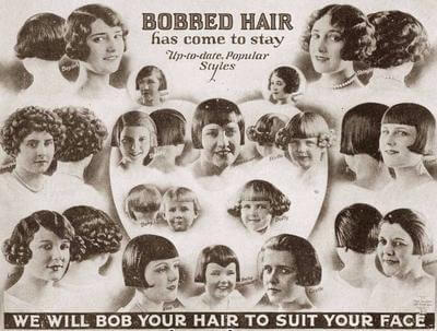 Enter the 1920s! A generation of men had died in WWI, motorcars and movies became common features of American life, white women got the vote, and more of them entered the workforce. And along with those changes came The Bob! The 1920s was really the first period to see a widespread obsession with being modern and youthful, and to see the development of a distinct “youth culture.” Short hair was part of that culture: modern girls wore bobs, which was also a way of claiming the privileges of masculinity.